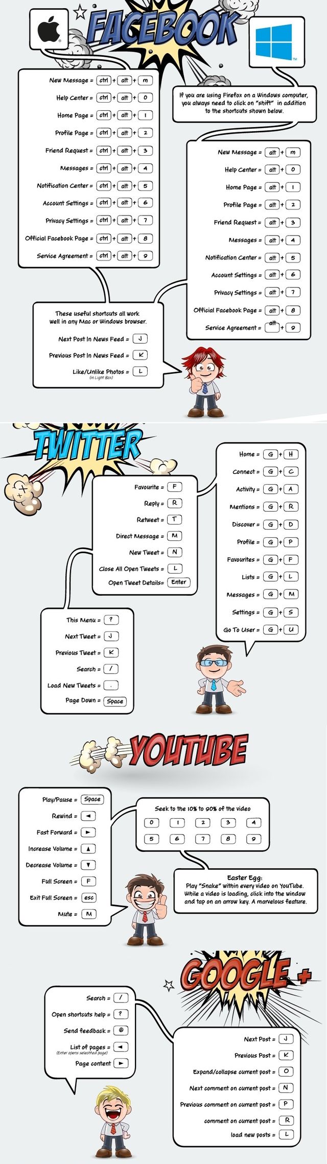 Esta bonita infografía nos muestra de forma muy vistosa, al estilo cómic, cuales son las combinaciones de teclas que podemos usar en algunas conocidas redes sociales: Facebook, Google+, YouTube y Twitter.