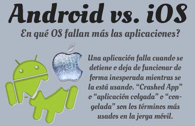 Se trata de una infografía creada por la gente de Android Jefe y titulada “Android vs. iOS: ¿En qué OS fallan más las aplicaciones?“. Para su creación se han basado en un estudio llevado a cabo por Crittercism, un sitio que ha monitorizado el uso de apps móviles en más de mil millones de dispositivos, entre iOS y Android.
