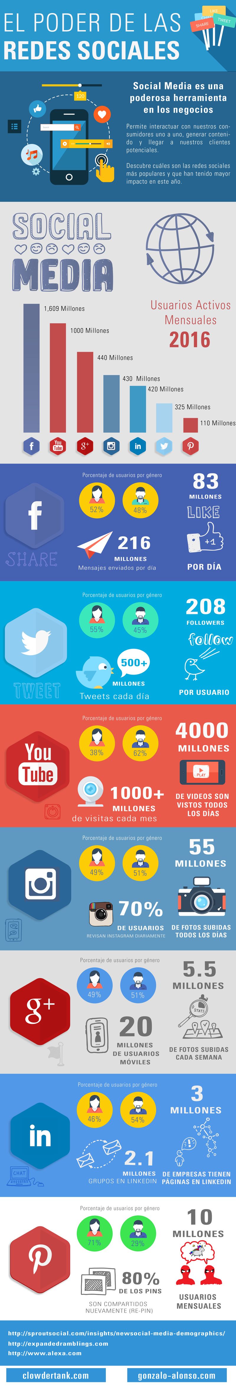 El título del documento gráfico es “El Poder de las Redes Sociales“, se trata de un trabajo del sitio de Gonzalo Alonso, y nos ofrece una gran cantidad de cifras y datos actualizados al presente año 2016.