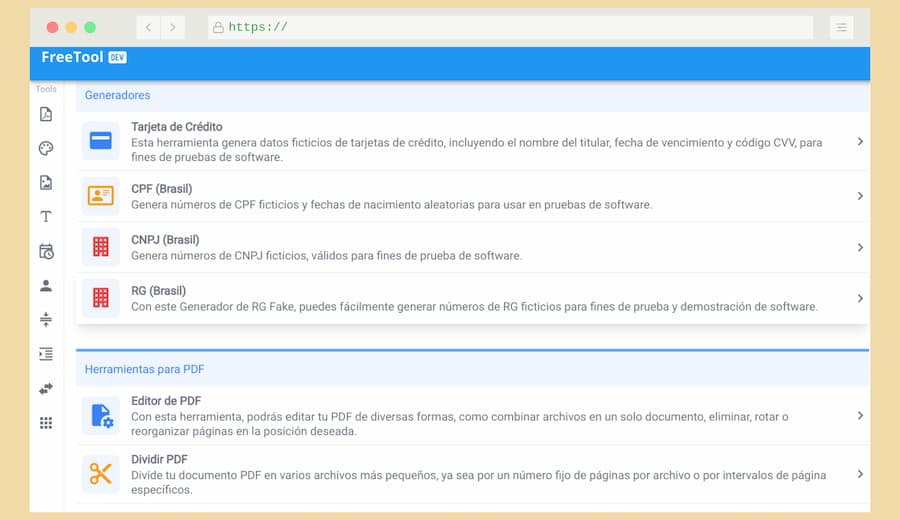FreeTool DEV es un sitio que ofrece una amplia y variada colección de herramientas online para desarrolladores y creativos, por supuesto también para cualquiera que pueda necesitarlas. Todas estas herramientas son de uso gratuito y se pueden usar sin tener que crear una cuenta o registrarse.